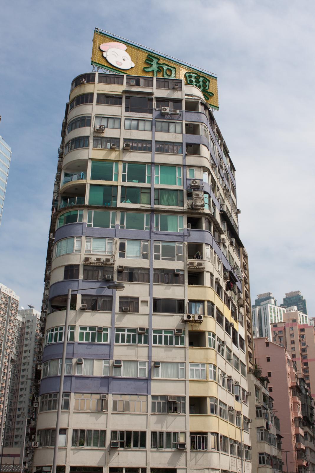 Mid-century Hong Kong apartment block with rooftop sign Hong Kong, China