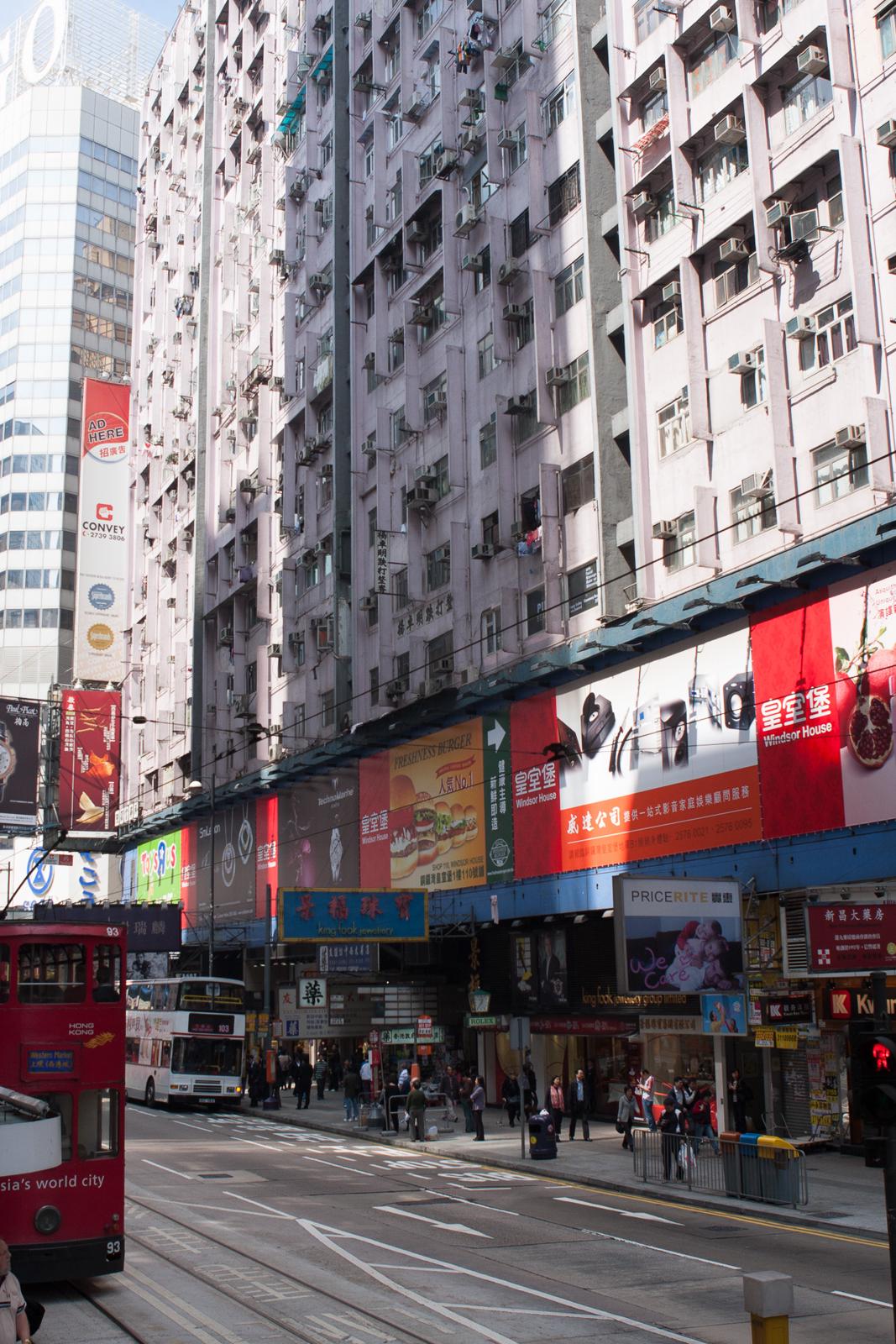 Street scene with Hong Kong tram and dense apartment blocks (Wan Chai/Causeway Bay, Feb 2009) Hong Kong, China
