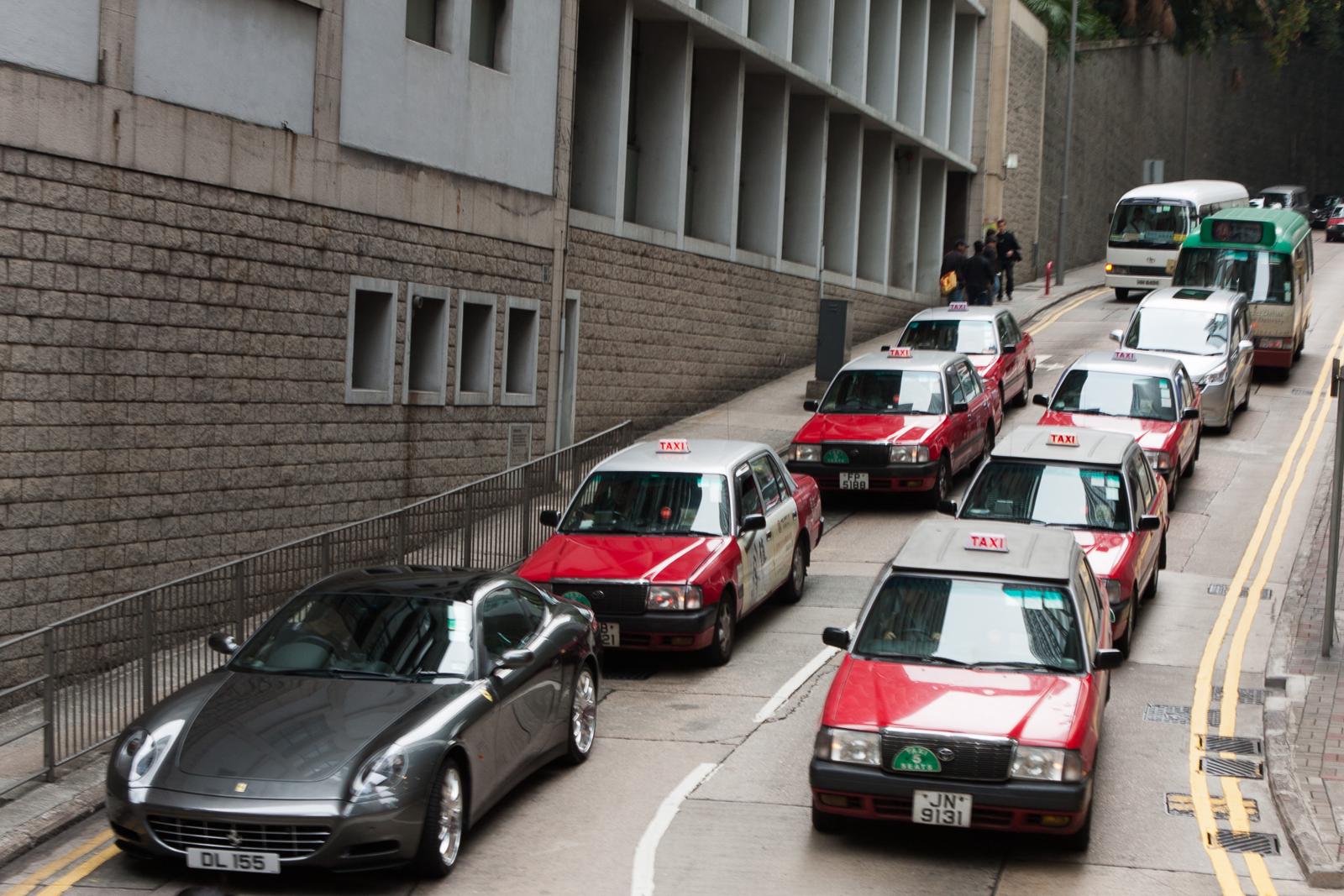 Hong Kong red taxis queuing on a narrow Central District street (Feb 2009) Hong Kong, China