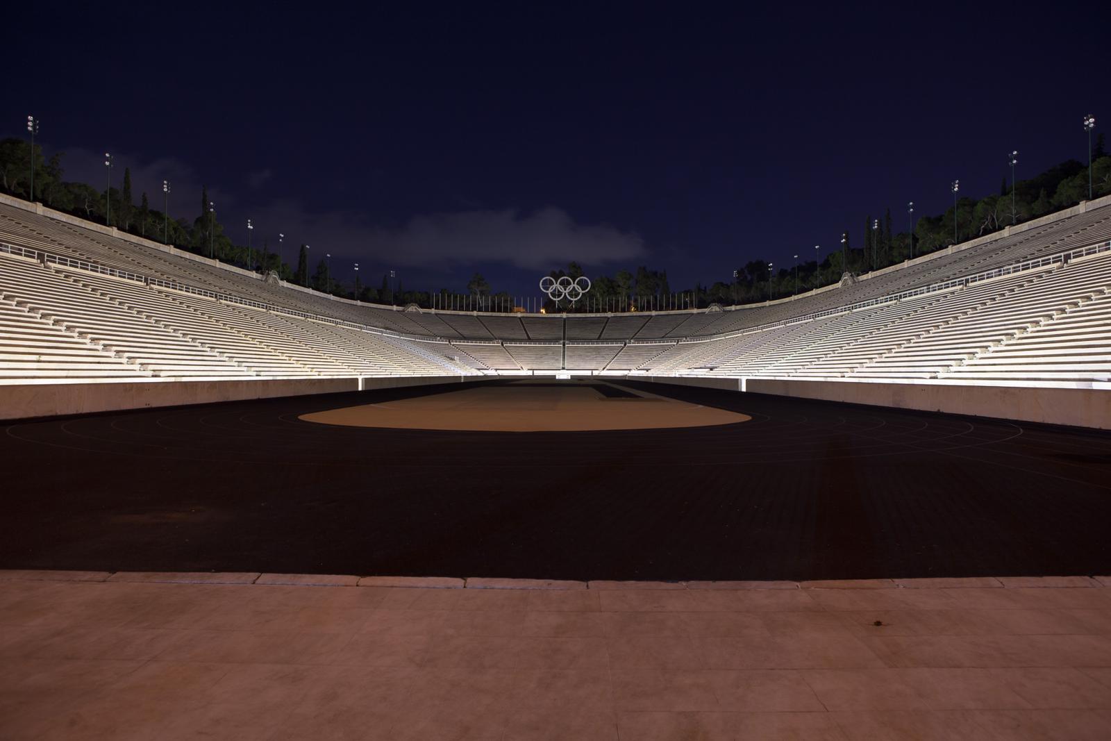 Panathenaic Stadium at Night with Olympic Rings Athens, Greece