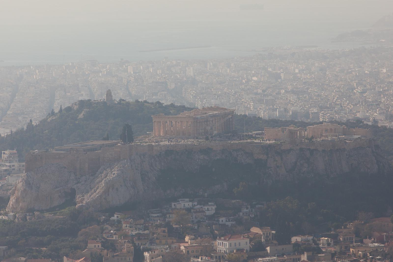 Parthenon on the Acropolis with Athens in haze Athens, Greece