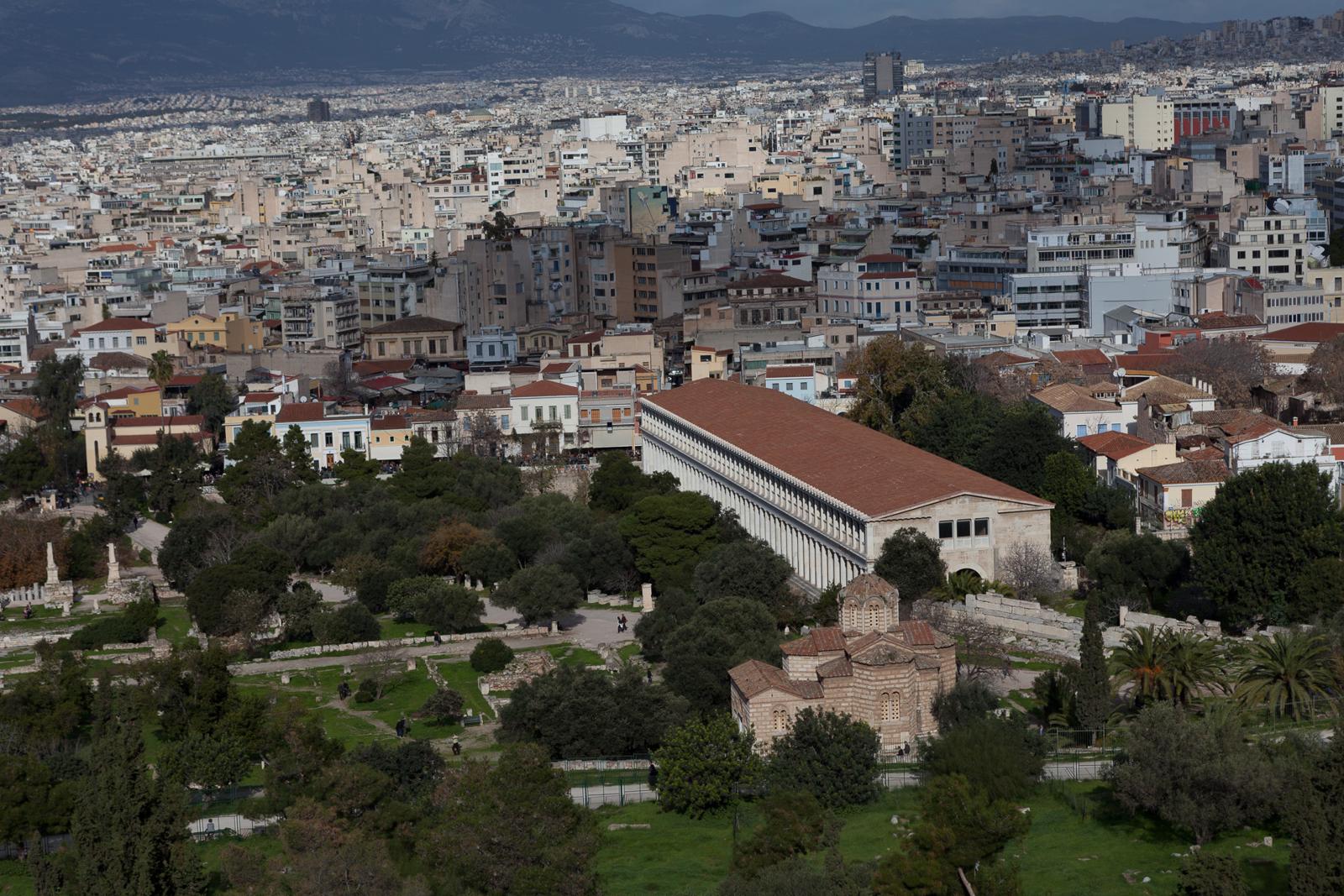 Athens cityscape with the Stoa of Attalos in the foreground Athens, Greece